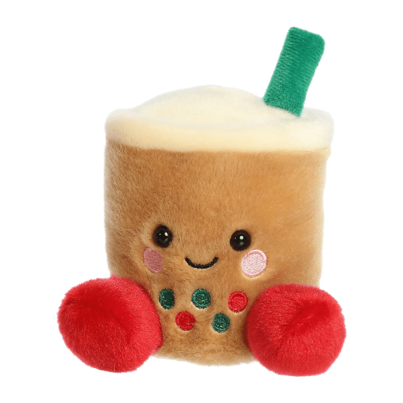 The Palm Pals™ Chewy Festive Boba™ Plush is a golden-brown stuffed toy with colourful embroidered boba pearls, a fluffy whipped top, and a cheerful green straw. Soft and huggable, Chewy adds playful charm and bubbly holiday cheer to any collection. This festive plush makes a perfect gift or present for snuggles, seasonal décor, and joyful celebrations.