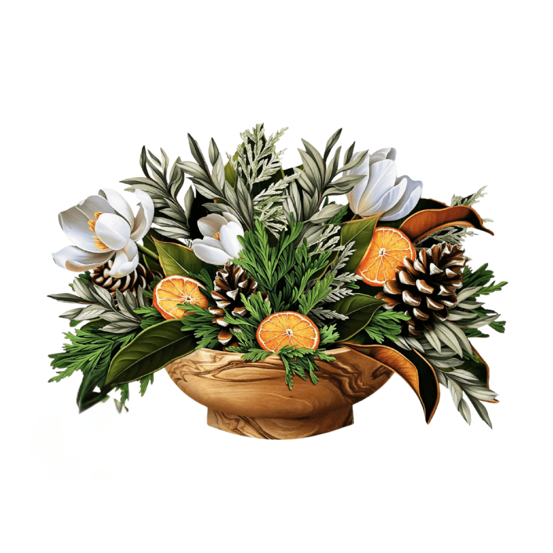 Winter Magnolia brings elegant charm to gatherings, blending magnolia blooms with festive accents in a rustic bowl, creating a centerpiece to share seasonal magic.