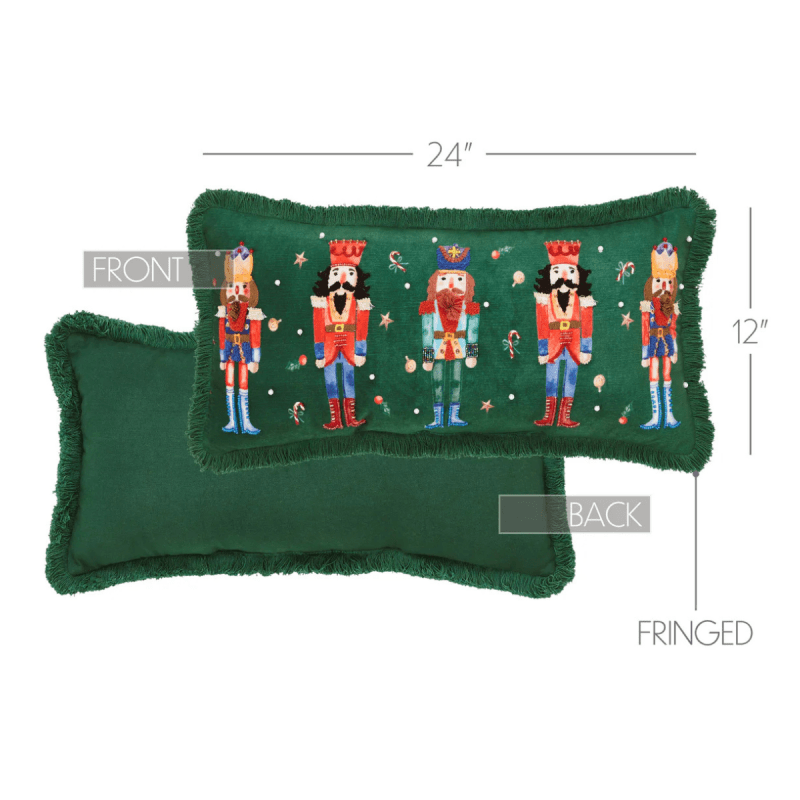 Traditional nutcracker pillow features five colorful figures, festive ornaments, candy canes, and pearl accents, with vibrant colors and fringed edges, adding charm to any holiday space.