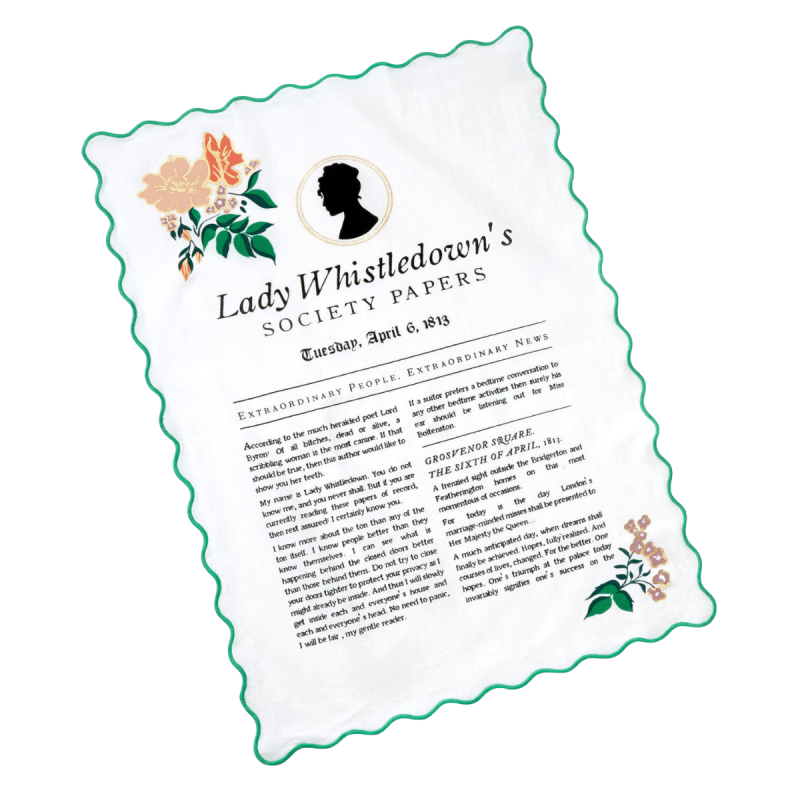 Bring a touch of Regency intrigue to the kitchen with the Bridgerton Lady Whistledown’s Society Papers Tea Towel. Inspired by the infamous gossip sheets of the Ton, this cotton towel features printed text from Lady Whistledown’s writings, accented with turquoise satin-stitch embroidery along the scalloped edge and delicate gold floral details. A charming accent for everyday use or display, it’s perfect for fans of the beloved Shondaland series.