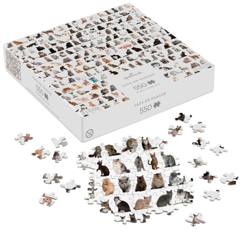 Surprise puzzle lovers with the Cats on Parade 550-Piece Jigsaw Puzzle, a fun gift or present featuring playful cats, perfect for cozy family time, and relaxing, screen-free entertainment!