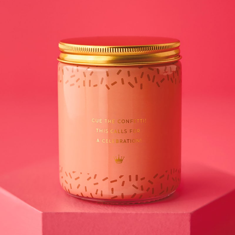 Celebrate life’s standout moments with the Congrats! Scented Single-Wick Jar Candle. Featuring a cheerful confetti design and celebratory message, this single-wick candle is housed in a glass jar with a coordinating metal lid. The bright blend of orange and sparkling pear creates a fresh, feel-good fragrance that captures the excitement of achievement.