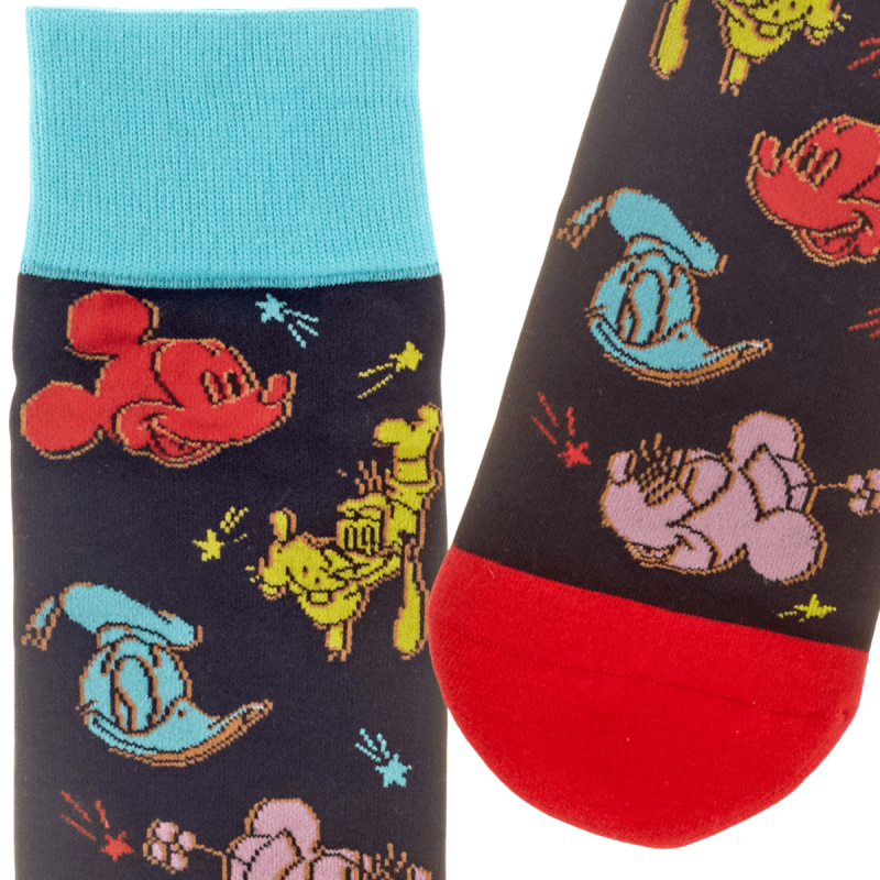 Add a pop of Disney magic to your outfit with Disney Mickey Mouse and Friends Colourful Crew Socks. Featuring Mickey and friends in vibrant colours on black socks, with matching bright cuffs, heels, and toes, these playful socks are perfect for fans, collectors, and anyone who loves whimsical style. A fun and cheerful gift for Disney enthusiasts of all ages.