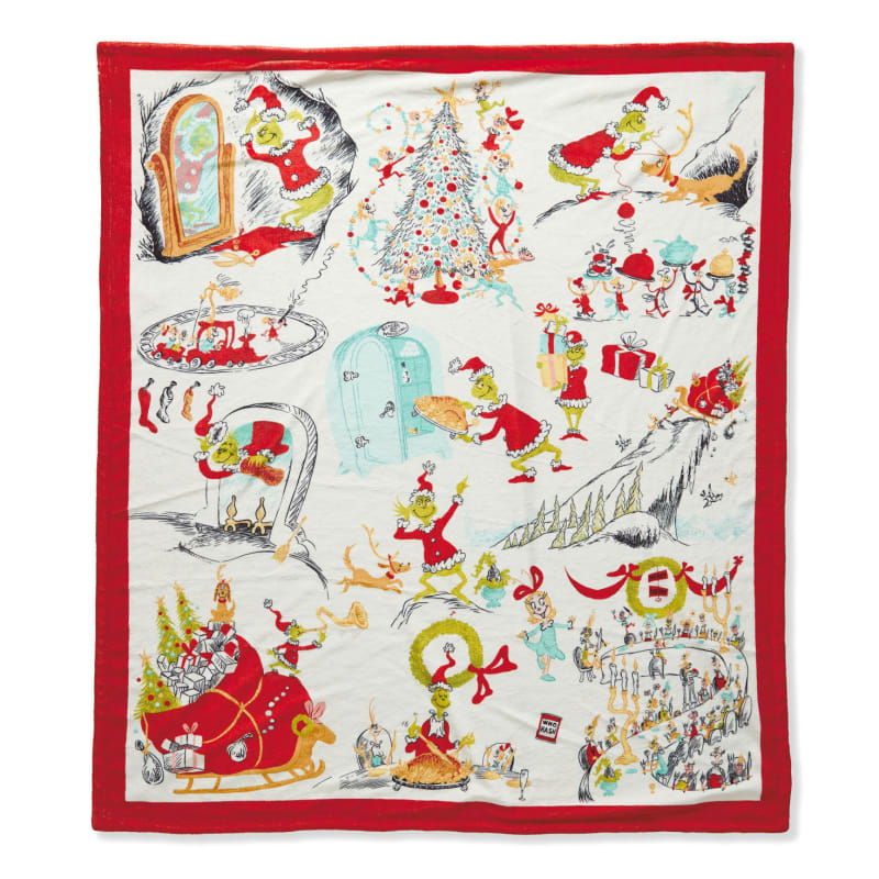 Wrap up the perfect gift or present with this cozy Grinch throw blanket! Featuring storybook scenes from How the Grinch Stole Christmas!, it’s a festive must-have for holiday lounging.