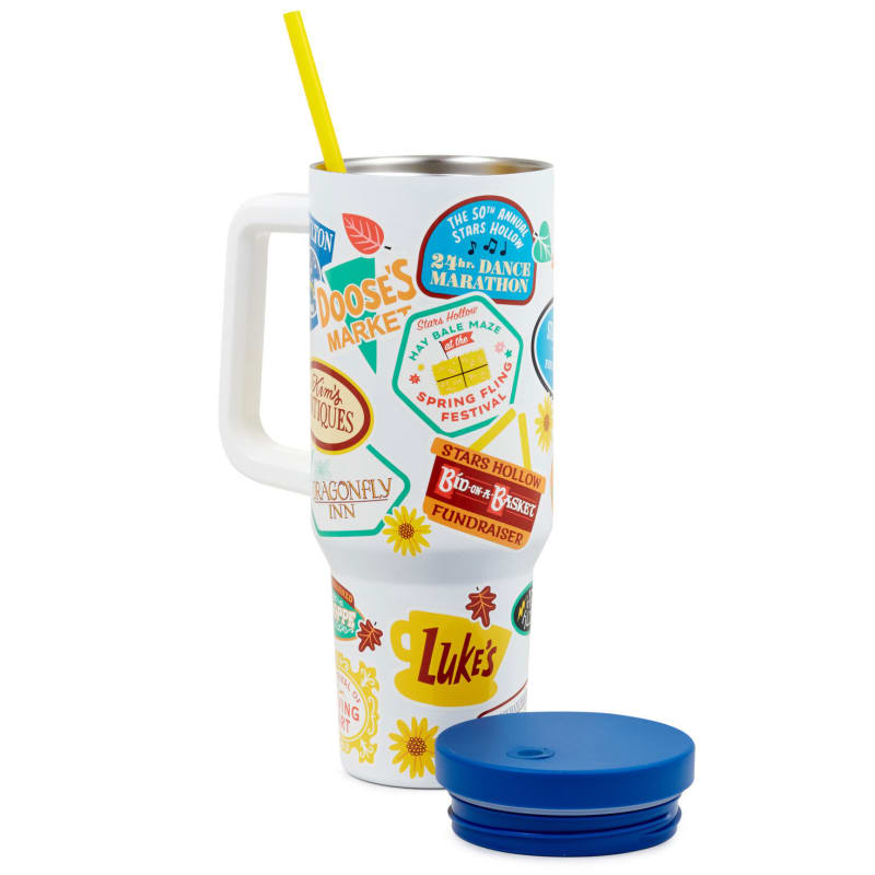 Stay refreshed throughout the day with the Gilmore Girls Stars Hollow Town Festivals Insulated Travel Cup. This 40-ounce insulated metal tumbler features a colourful sticker-style collage inspired by the many festivals and events of Stars Hollow. Designed to keep cold drinks chilled, it includes a spill-resistant blue lid, a bright yellow straw, and a sturdy handle for easy carrying.