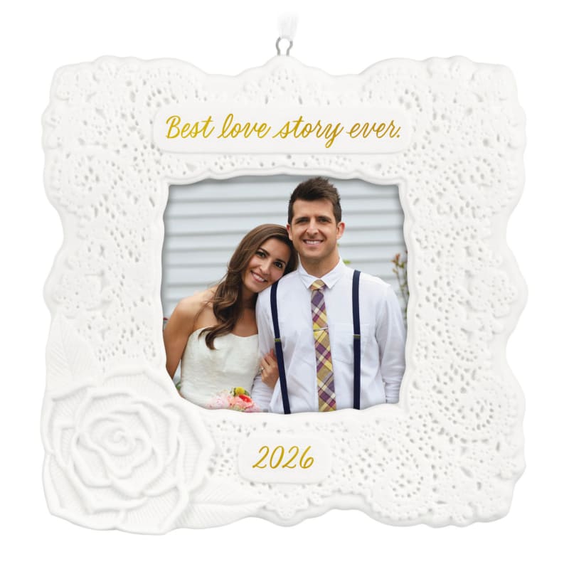 Honour the beginning of a beautiful journey together with the Best Love Story Ever 2026 Photo Frame Porcelain Ornament. Designed with an elegant lace-inspired pattern and a delicate rose accent, this year-dated photo frame ornament showcases a favourite wedding memory in timeless style.