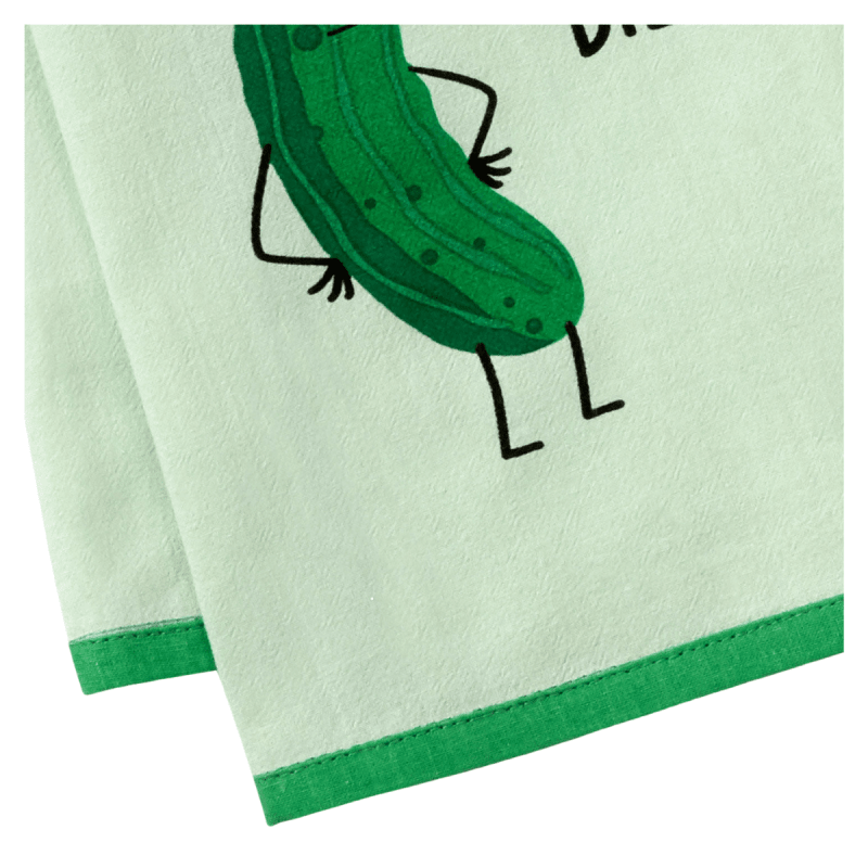 - Tea towel features a screen-printed dill pickle wearing sunglasses design with a punny message and a bright green border.