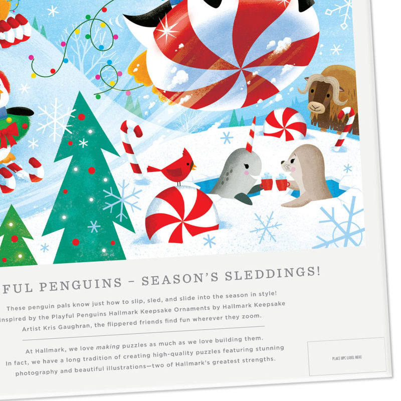 Glide into holiday fun with the Playful Penguins Season’s Sleddings 550-Piece Jigsaw Puzzle! Featuring the adorable penguin trio racing down a snowy mountain on peppermints and candy canes, this charming puzzle brings festive cheer to family game nights. Fans of Hallmark’s beloved Playful Penguins collection will love how this delightful scene coordinates with the matching plush and children’s book (each sold separately).