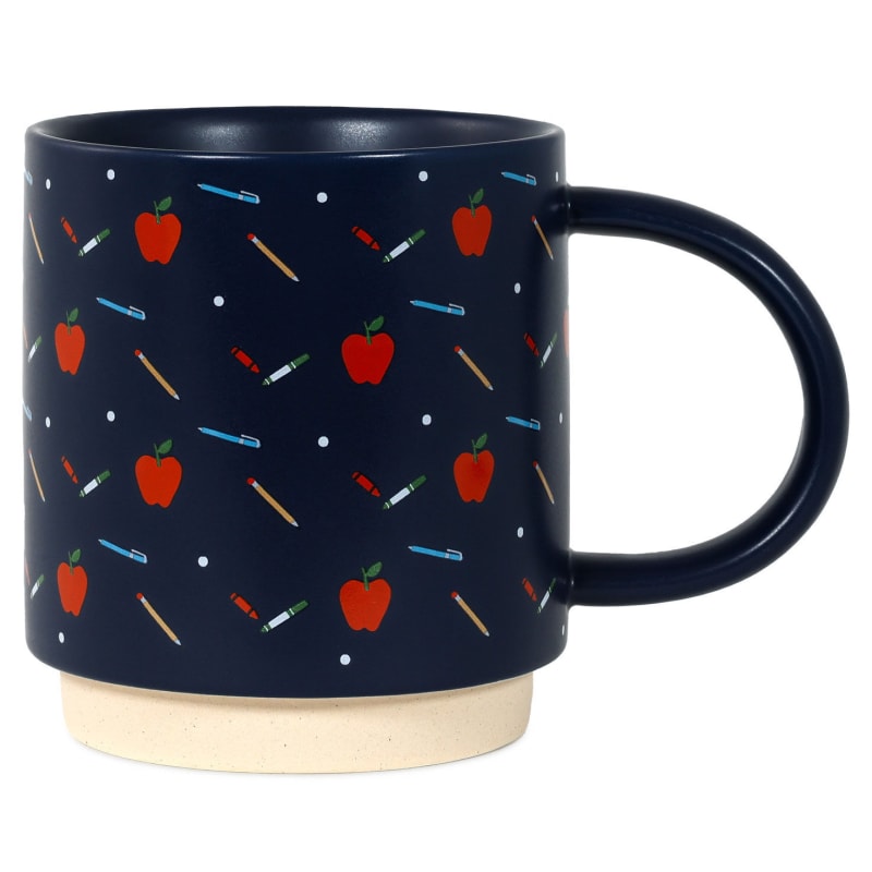 Brighten an educator’s day with the School Supplies Navy Teacher Mug. This 16-ounce ceramic mug features a playful collage of pens, pencils, crayons, apples, and polka dots. With an oversized handle for comfort and a recessed base for easy stacking, it’s perfect for coffee, tea, or even holding school supplies.