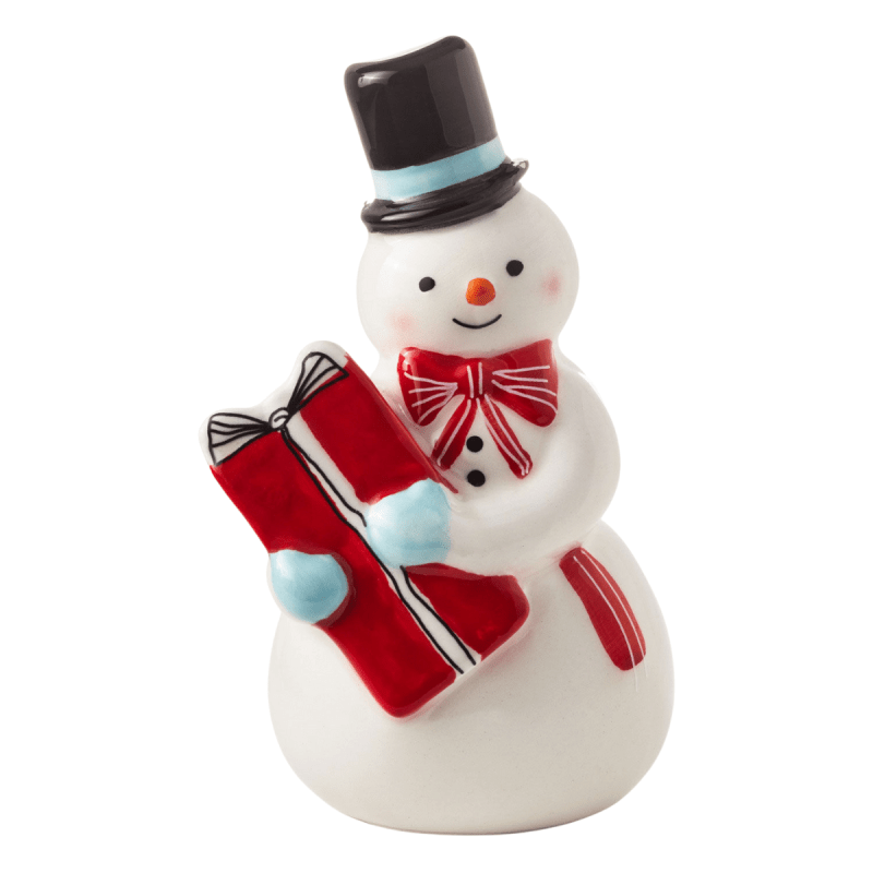 Enhance your buffet or party table with this charming ceramic snowman toothpick holder, perfect for keeping toothpicks readily available for guests. Its vintage design adds a delightful touch to any setting. Place it next to a cheese platter or charcuterie board during holiday gatherings, or gift it as a practical and festive hostess present. Dressed in a black top hat and a striped red bow tie, this painted snowman holds toothpicks with a whimsical flair in his angled, wrapped package.