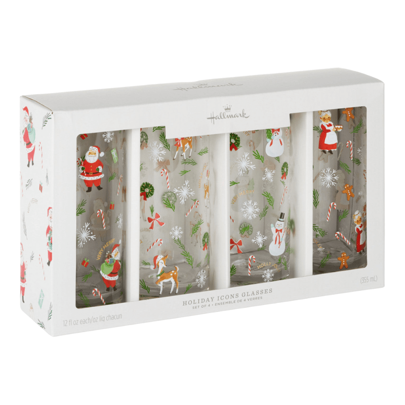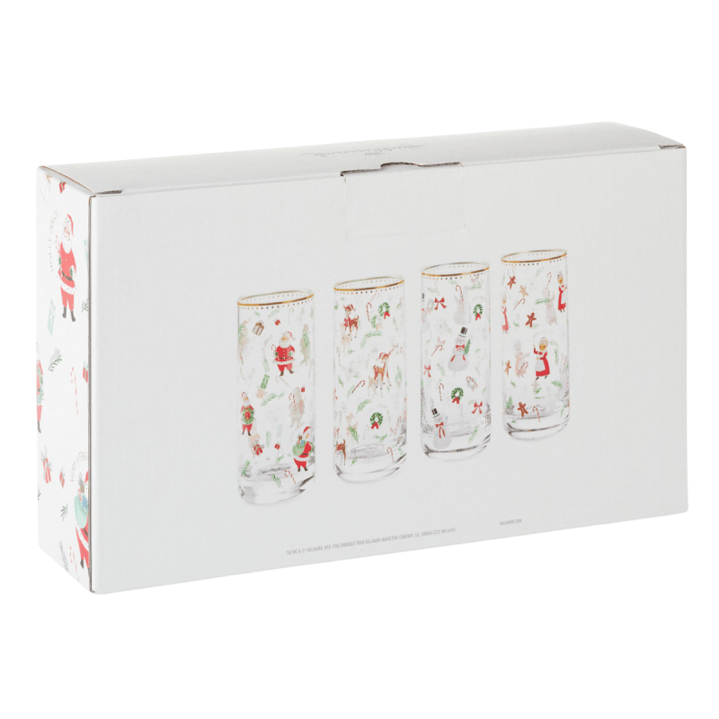 Bring a touch of vintage Christmas charm to your table with this set of four drinking glasses. Each glass showcases a different holiday character—Santa, Mrs. Claus, a snowman, and a reindeer—surrounded by festive designs like candy canes and presents. The 12-ounce glasses are accented with gold foil trim, adding a special holiday sparkle to every sip.