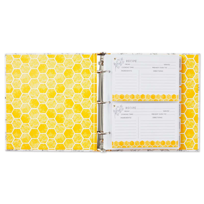 Keep your favourite recipes beautifully organized with the Yellow Honeycomb Recipe Organizer Book. Featuring charming herb and bee illustrations, this 3-ring book includes 20 double-pocket sleeves for 4x6 cards, tabbed dividers, a reference section, and 40 coordinating recipe cards. Perfect as a gift or present for home cooks and chefs who love creating delicious dishes.