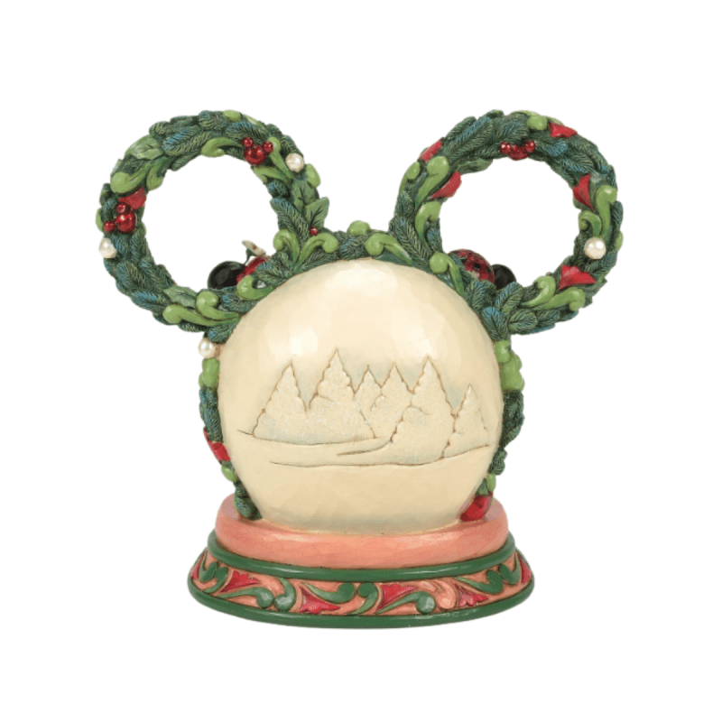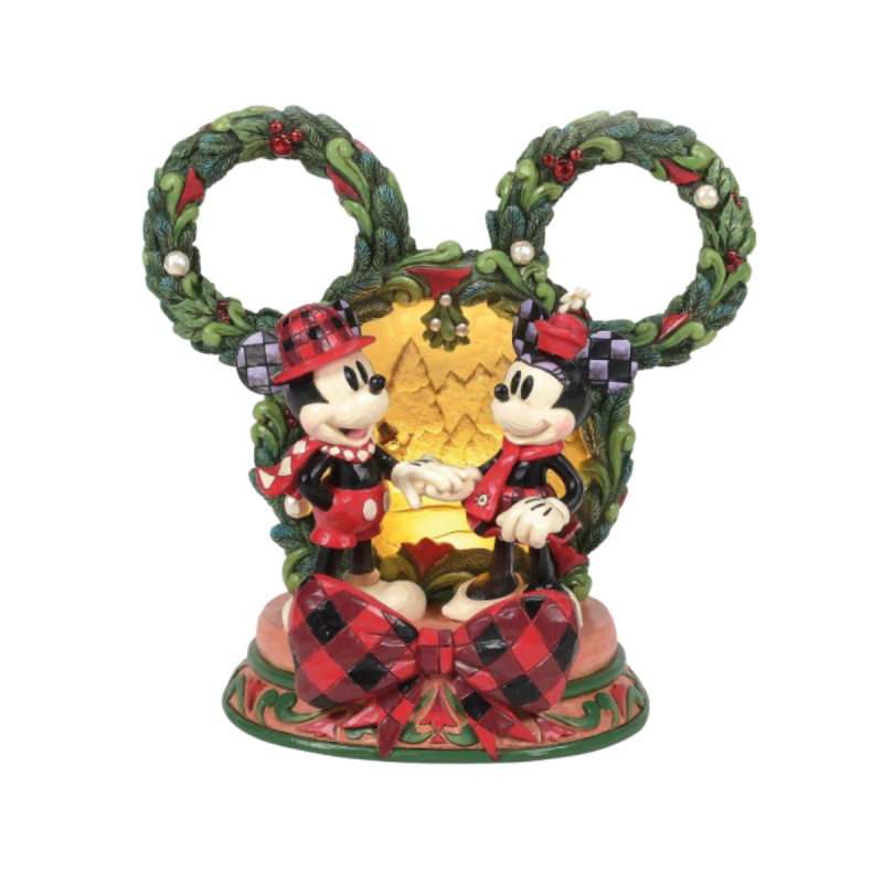 Mickey and Minnie spread holiday cheer in this festive Jim Shore figurine. Beneath a glowing LED diorama framed by a festive Mickey-shaped garland, the scene radiates holiday magic and timeless Disney charm.