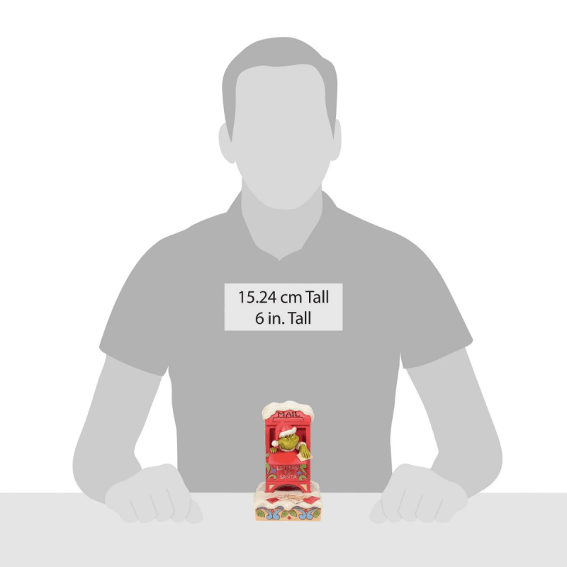 The Grinch hides inside a red mailbox in this playful Jim Shore figurine, tearing up Santa letters with a mischievous grin. Detailed with rosemaling and patchwork, it captures his festive mischief.