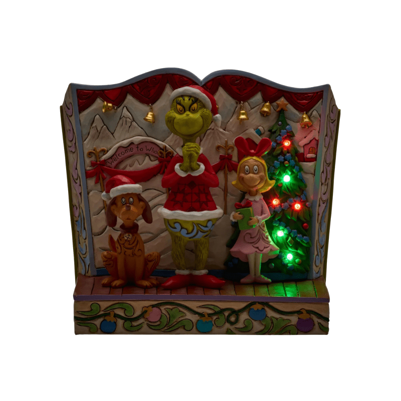 This festive Jim Shore figurine showcases the Grinch’s joyful transformation, standing beside Cindy Lou and Max. With Santa attire, rosemaling details, patchwork patterns, and a real jingle bell, it brings Seuss-inspired holiday magic home.
