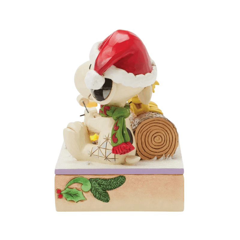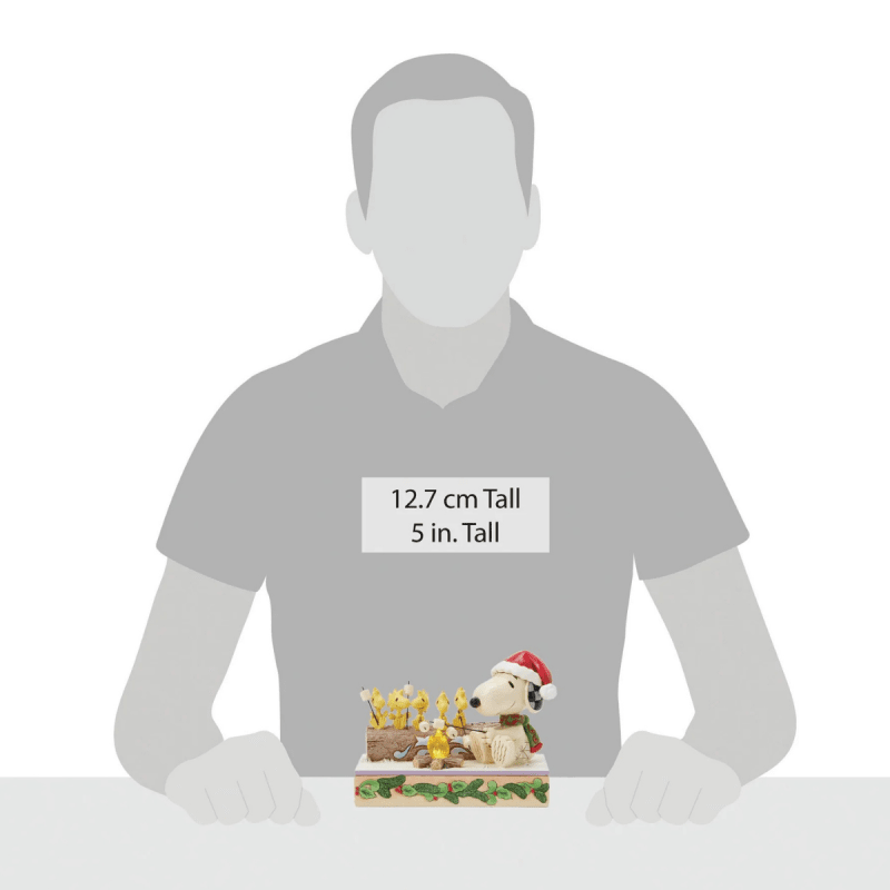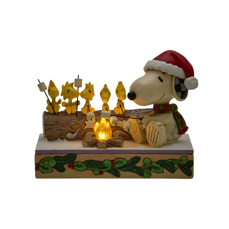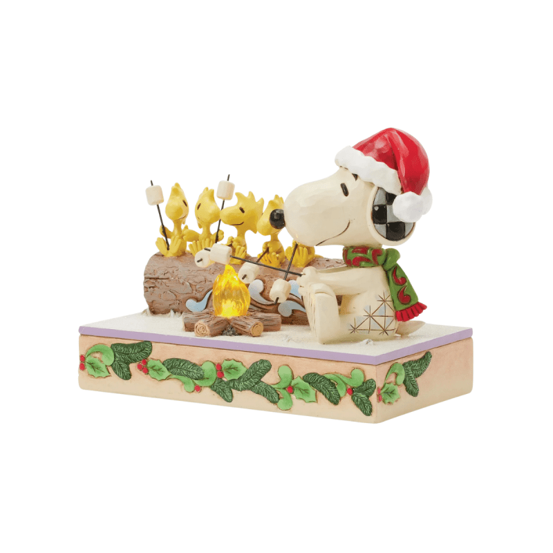 Add warmth to your Christmas décor with this delightful Jim Shore figurine featuring Snoopy and Woodstock roasting marshmallows by a glowing LED fire. Dressed in a Santa hat, Snoopy shares holiday joy with his feathered friends.