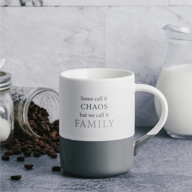 Crafted from durable stoneware, this generously sized mug features a modern shape and a large, easy-to-hold handle for everyday comfort. The matte white exterior highlights a heartfelt family-themed sentiment, while the glossy interior and gray colour-block base add a clean, contemporary finish. Designed to complement any kitchen collection, it blends refined style with a warm, relatable message.
