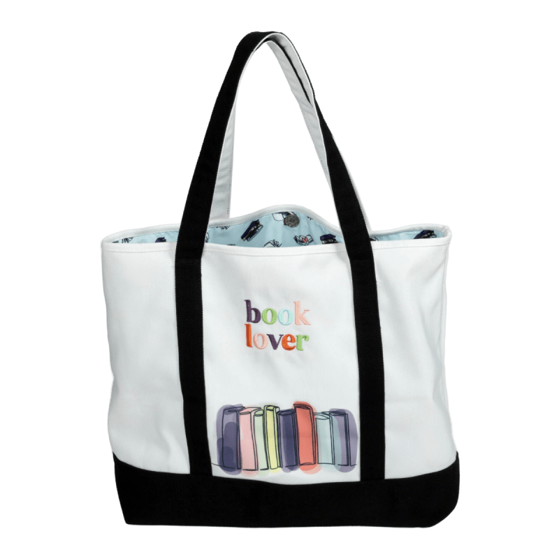 This tote is designed for everyday use with a sturdy, structured shape, reinforced handles, and a secure magnetic closure. The front features printed and embroidered artwork, while a coordinating interior pattern and side logo tag add thoughtful detail. Showcasing the phrase “book lover” above a colourful row of illustrated books, it blends playful charm with a clean, modern aesthetic. Inside, an all-over book pattern adds a hidden touch of personality, making this tote both stylish and delightfully book-inspired.