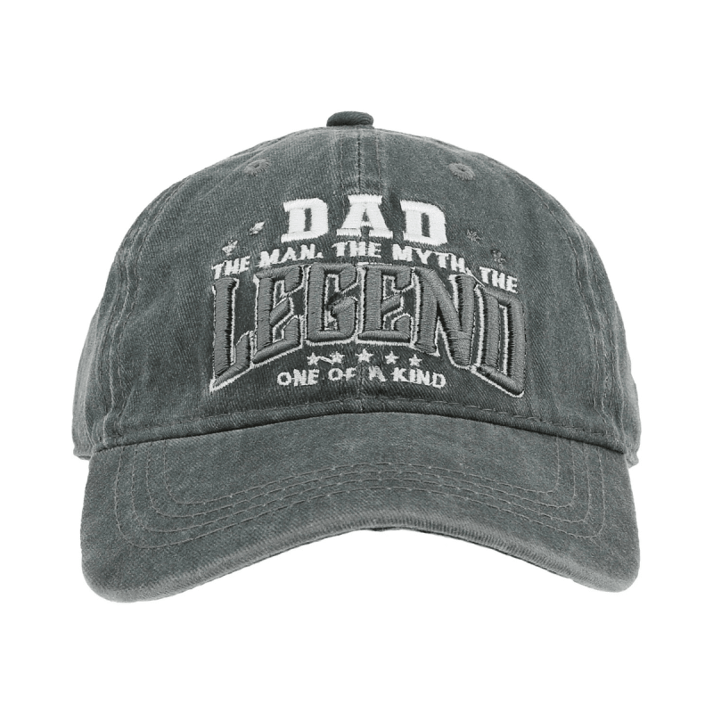 - This cotton grey hat features a heartfelt message reading "Dad, The Man, The Myth, The Legend - One Of a Kind."