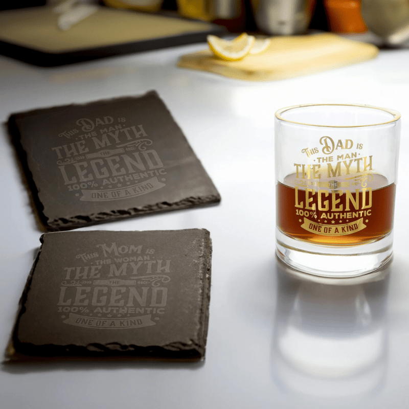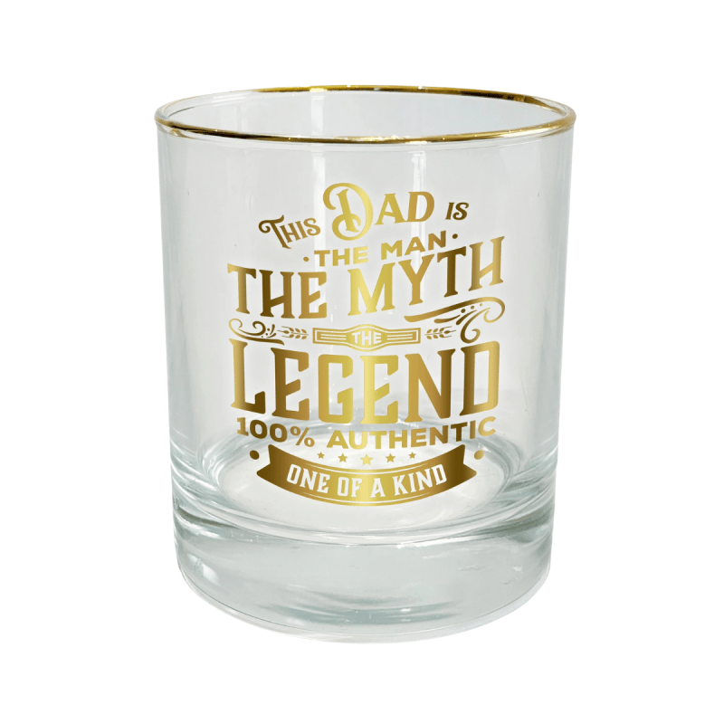 This old-fashioned rocks glass delivers a classic and refined drinking experience. It features a gold electroplated rim and a bold front decal reading “This Dad Is The Man, The Myth, The Legend, 100% Authentic, One Of A Kind,” accented with banners and stars for a stylish finish.