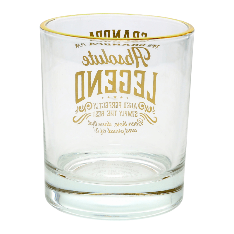 This old-fashioned rocks glass offers a classic and refined drinking experience. It features a gold electroplated rim and a bold front decal reading “This Grandpa Is An Absolute Legend, Aged Perfectly, Simply The Best, Been There, Done That And Proud Of It!” accented with banners and stars for a stylish touch.