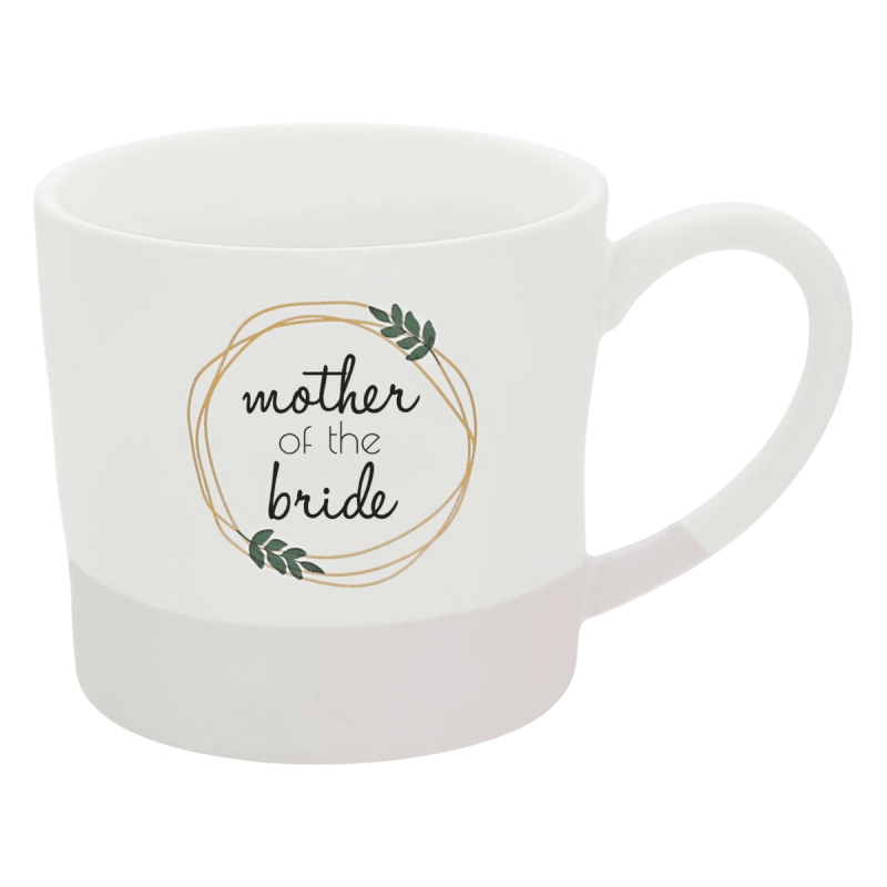 Crafted from durable stoneware, this 15 oz mug features a unique dimpled texture and a sturdy, comfortable handle for everyday use with hot or cold beverages. The design showcases “Mother of the Bride” in a delicate black font, framed by a soft gold wreath with green accents, set against a matte white finish with an iridescent pearl glaze at the base for an elegant, meaningful touch.
