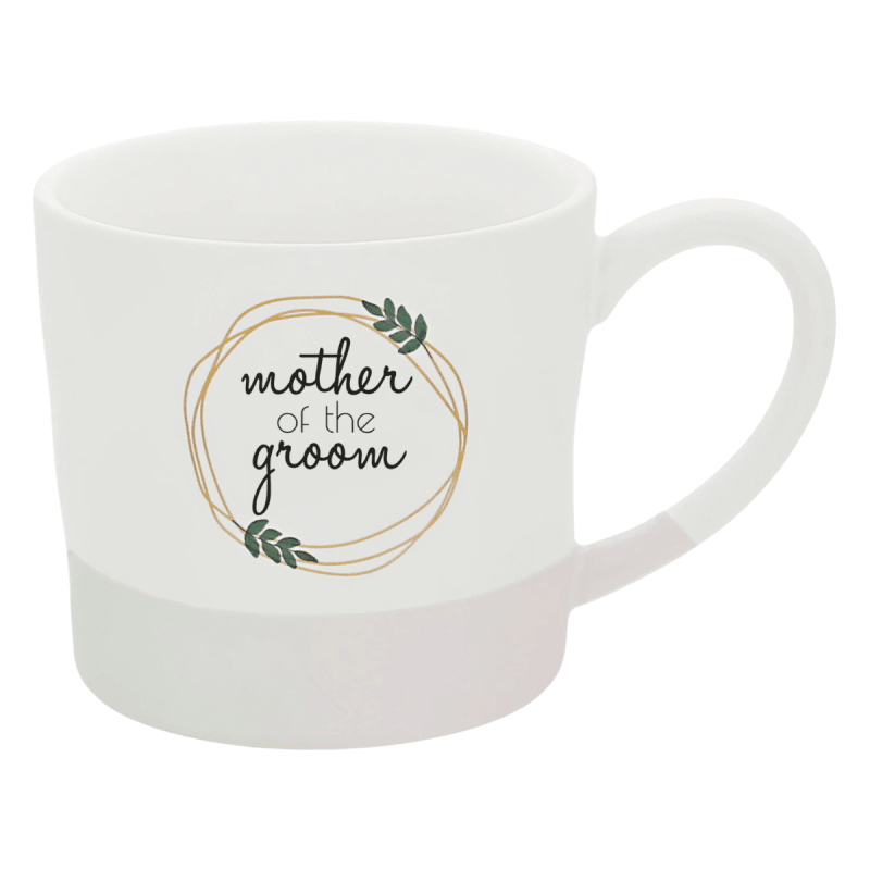 Crafted from durable stoneware, this 15 oz mug features a unique dimpled texture and a sturdy, comfortable handle for everyday use with hot or cold beverages. The design showcases “Mother of the Bride” in a delicate black font, framed by a soft gold wreath with green accents, set against a matte white finish with an iridescent pearl glaze at the base for an elegant, meaningful touch.