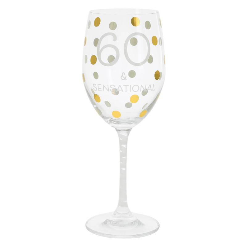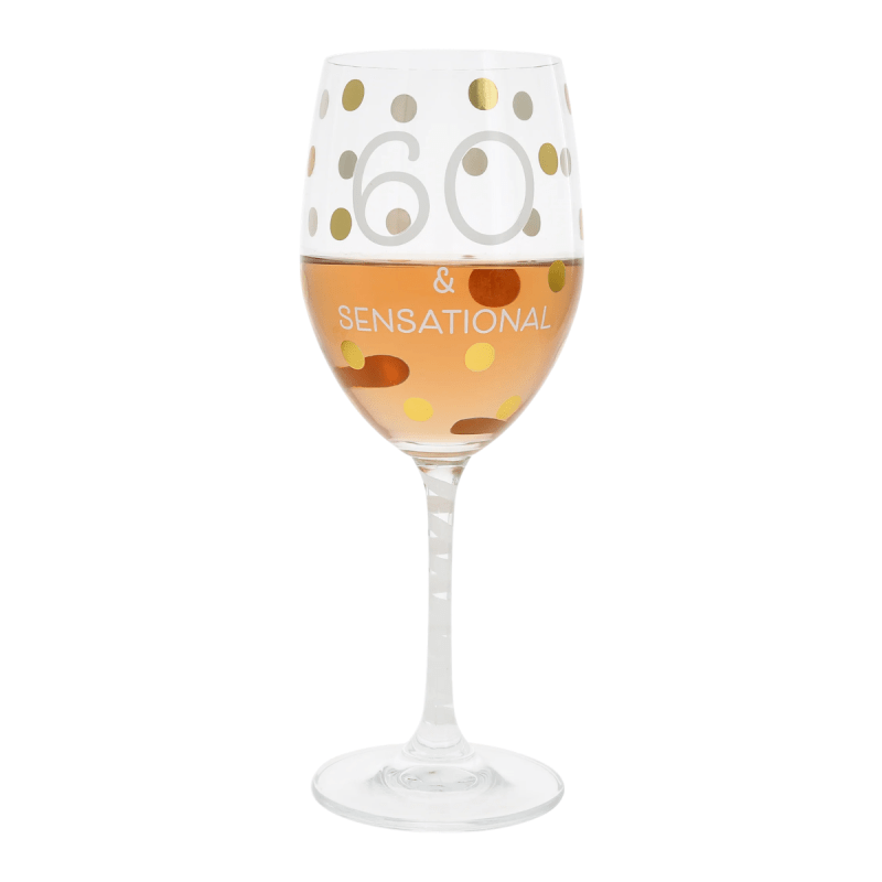 Crafted from durable, crystal-clear glass, this 19 oz stemmed wine glass features shimmering metallic gold accents and a spacious bowl designed for wine and cocktails. The elegant design blends quality and celebration, making it perfect for milestone moments. Featuring the uplifting “60 & Sensational” message surrounded by gold dot detailing, it beautifully celebrates confidence, joy, and timeless style at sixty.