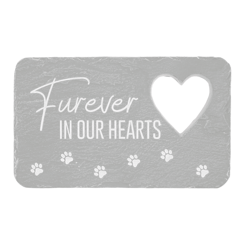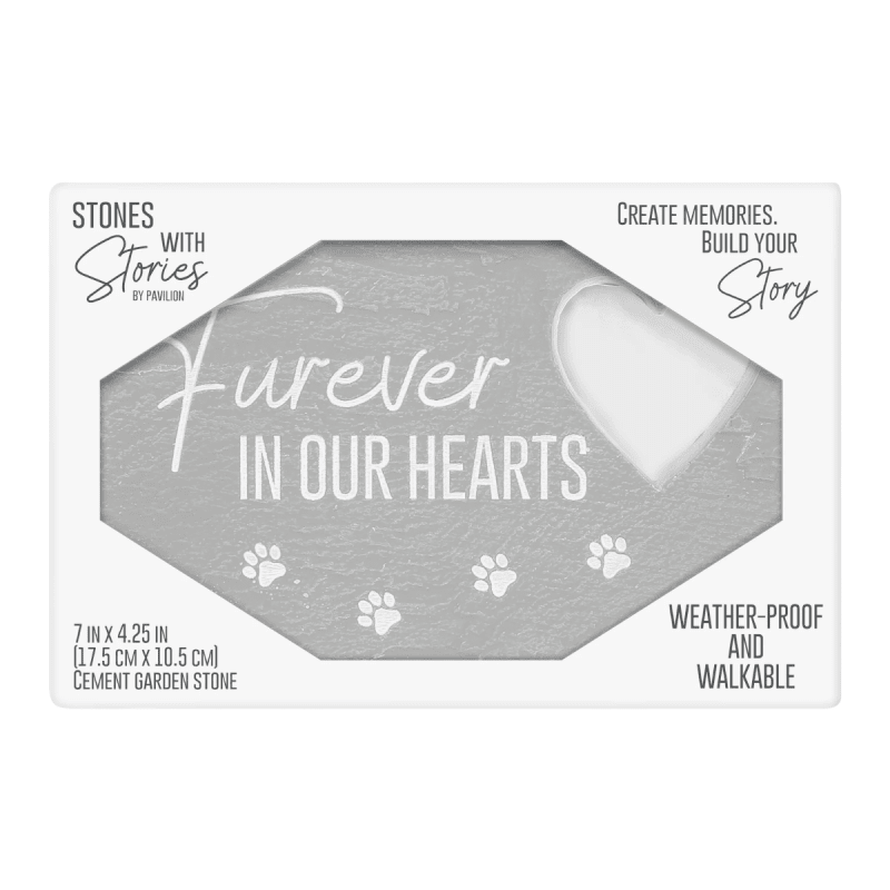 Crafted from durable, weather-resistant cement fiber, this rectangular garden stone is built to last while adding lasting charm to any space. Featuring a textured light gray surface, rounded edges, pawprints, a cut-out heart, and the sentiment “Furever In Our Hearts,” it’s a touching tribute that brings warmth, love, and a heartfelt reminder of a cherished pet to gardens, patios, or indoor displays.