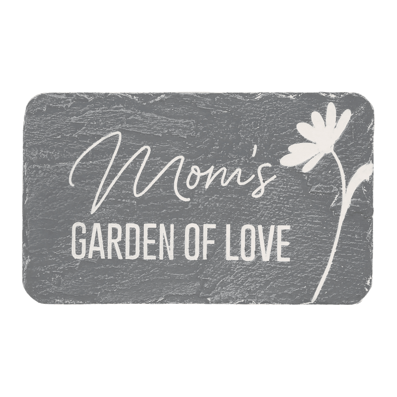 Crafted from durable, weather-resistant cement fiber, this rectangular garden stone is built to withstand the elements while adding lasting charm to any space. Featuring a textured dark gray finish, rounded edges, and a delicate flower silhouette alongside the sentiment “Mom’s Garden Of Love,” it brings warmth, love, and a heartfelt touch to gardens, patios, or indoor displays.