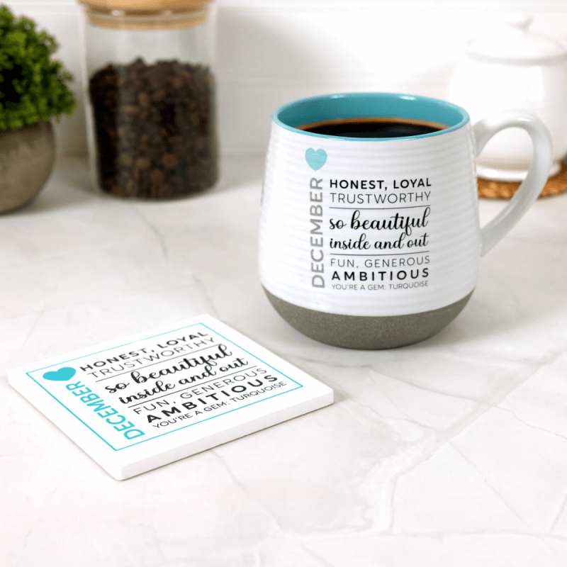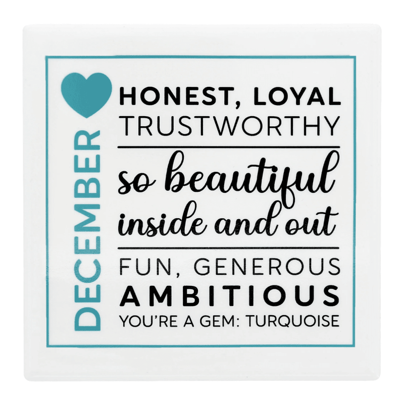 Crafted from durable ceramic, this coaster features vibrant, long-lasting artwork with crisp lettering designed for everyday use. The cork backing helps protect surfaces and prevent slipping, while the sturdy construction ensures lasting quality. Styled in a bright turquoise palette, it showcases December traits: honest, loyal, trustworthy, beautiful inside and out, fun, generous, and ambitious, finished with the sentiment “You’re a gem: Turquoise.”
