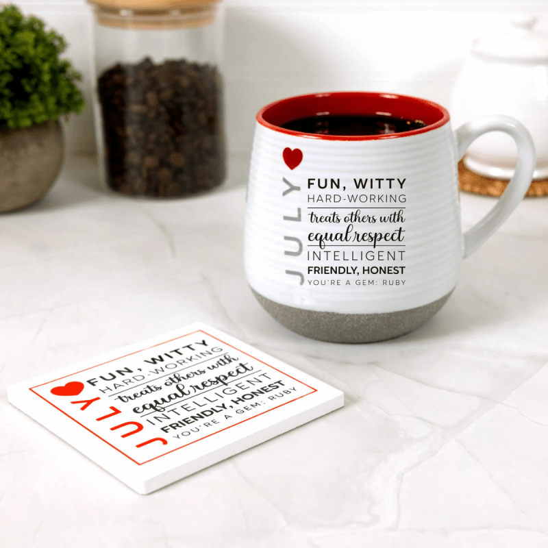 Crafted from durable ceramic, this coaster features vibrant, long-lasting artwork with crisp lettering for everyday use. The cork backing helps protect surfaces and prevent slipping, while the sturdy design ensures lasting quality. Showcasing bold July traits: fun, witty, hardworking, respectful, intelligent, friendly, and honest, it’s finished with a red heart accent and the sentiment “You’re a gem: Ruby.”