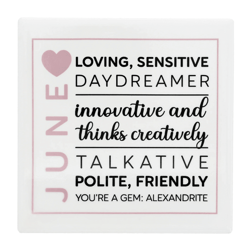 Crafted from durable ceramic, this coaster features vibrant, long-lasting artwork with crisp lettering for everyday use. The cork backing helps protect surfaces and prevent slipping, while the sturdy design ensures lasting quality. Designed in a soft purple palette, it highlights June traits: loving, sensitive, imaginative, creative, talkative, polite, and friendly, finished with the sentiment “You’re a gem: Alexandrite.”