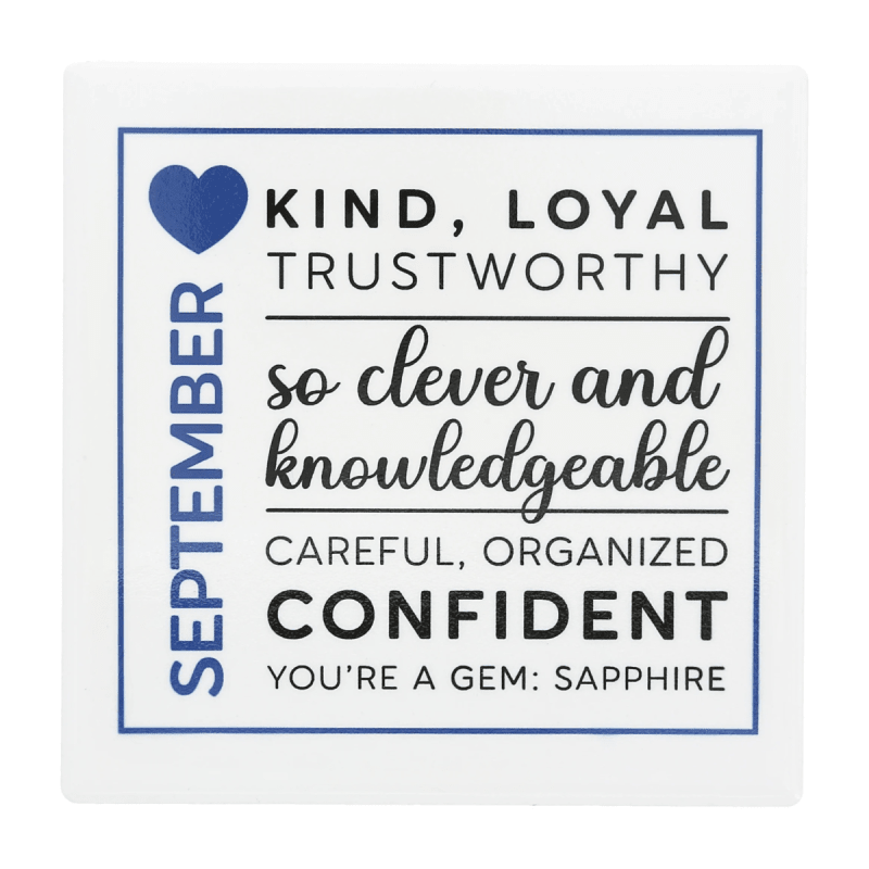 Crafted from durable ceramic, this coaster features vibrant, long-lasting artwork with crisp lettering for everyday use. The cork backing helps protect surfaces and prevent slipping, while the sturdy design ensures lasting quality. Designed in a rich blue palette, it highlights September traits: kind, loyal, trustworthy, clever, knowledgeable, careful, organized, and confident, finished with the sentiment “You’re a gem: Sapphire.”