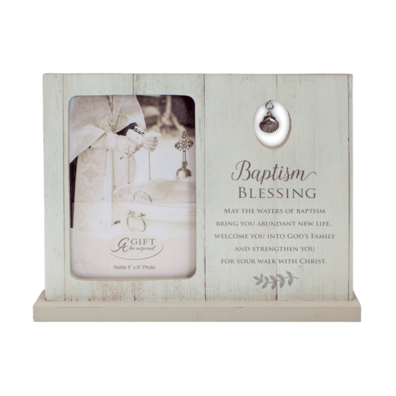 Gift the Baptism Blessing with Charm Standing Picture Frame, a perfect present that captures the essence of a baptism. This frame, adorned with a charming accent, blesses any home with grace.