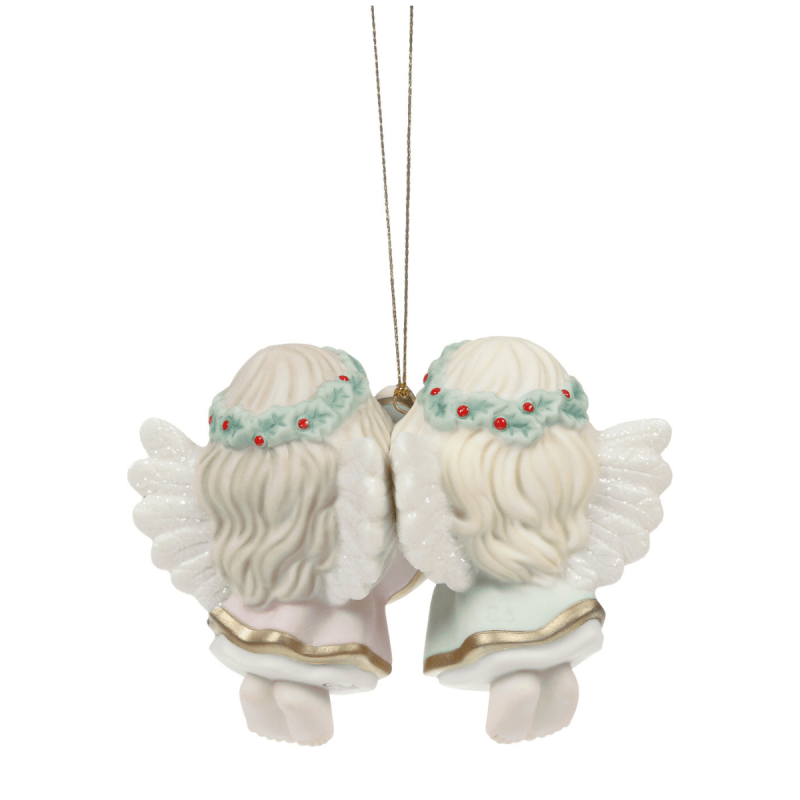A pair of angels lift a golden star, wearing holly halos and gold-trimmed robes. This Precious Moments ornament makes a delightful holiday gift for all.