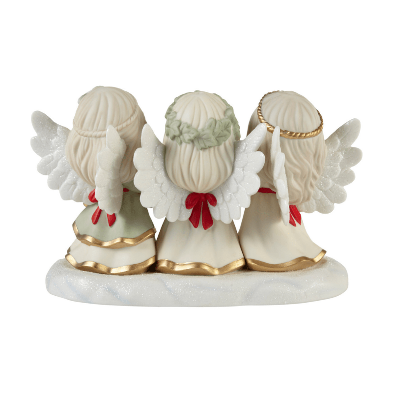 Precious Moments limited edition figurine features three angels with glittered wings and joyful expressions. A charming holiday gift for collectors and angel enthusiasts alike.