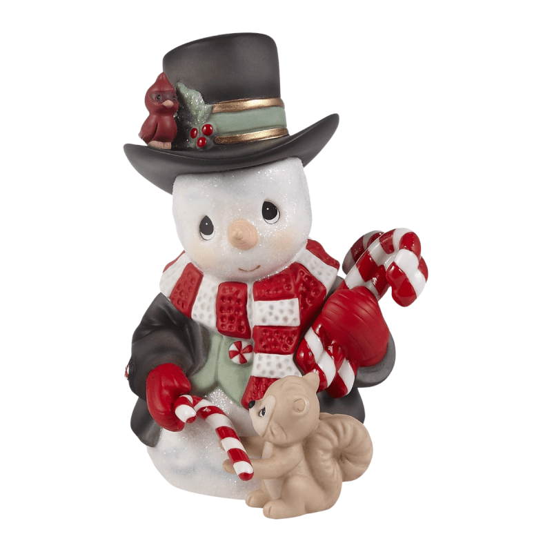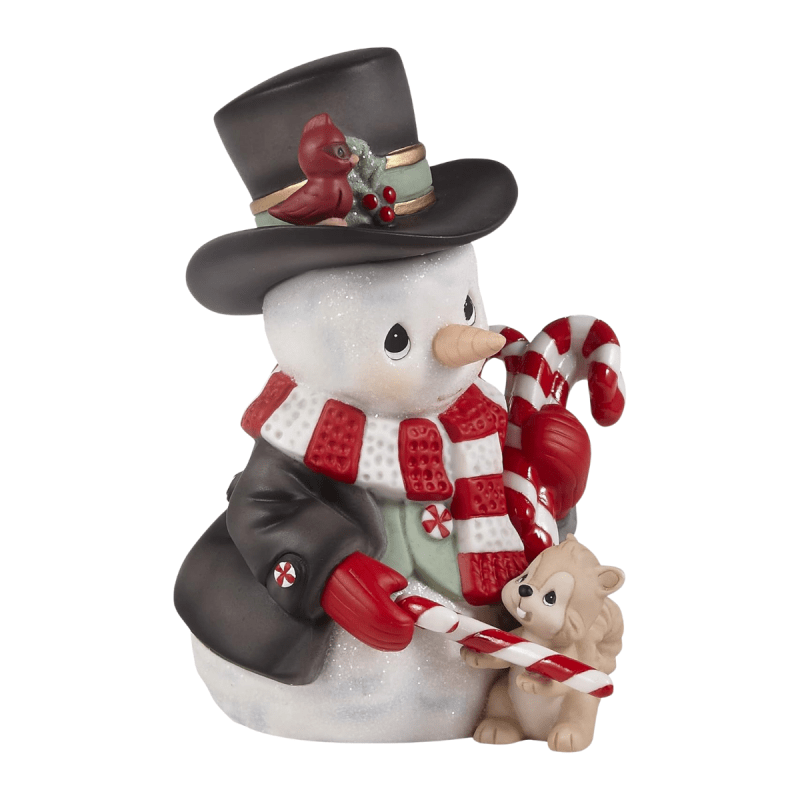 The 13th Precious Moments Annual Snowman figurine spreads holiday cheer, featuring a dapper snowman with a peppermint-trimmed vest, top hat, and candy cane wishes, perfect Christmas gift.